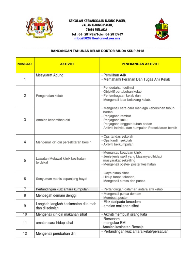 Rancangan Tahunan Kelab Doktor Muda Skup 2018 Sekolah Kebangsaan Ujong Pasir Jalan Ujong Pasir 75050 Melaka
